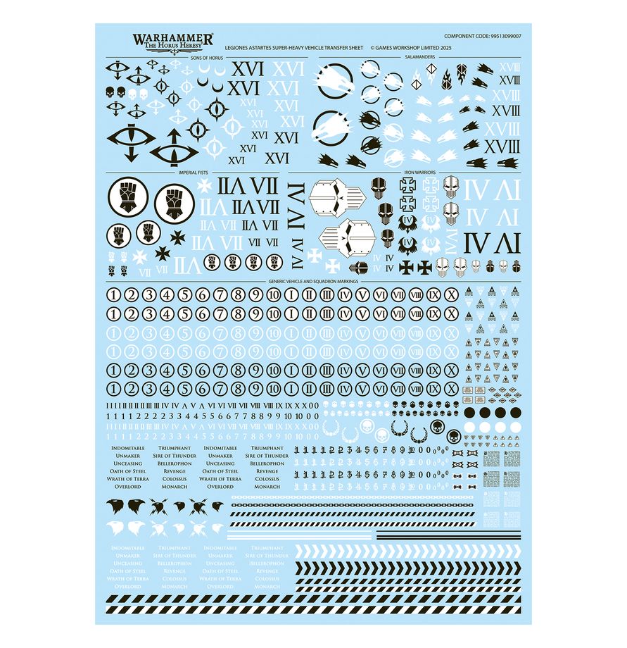 Цей набір постачається з аркушем декалей надважкої техніки Легіонес Астартес, який містить 718 високоякісних декалей. Серед них є значки Імперських Кулаків, Синів Горуса, Саламандр та Залізних Воїнів, а також номери та інші позначки для прикраси вашого танка.