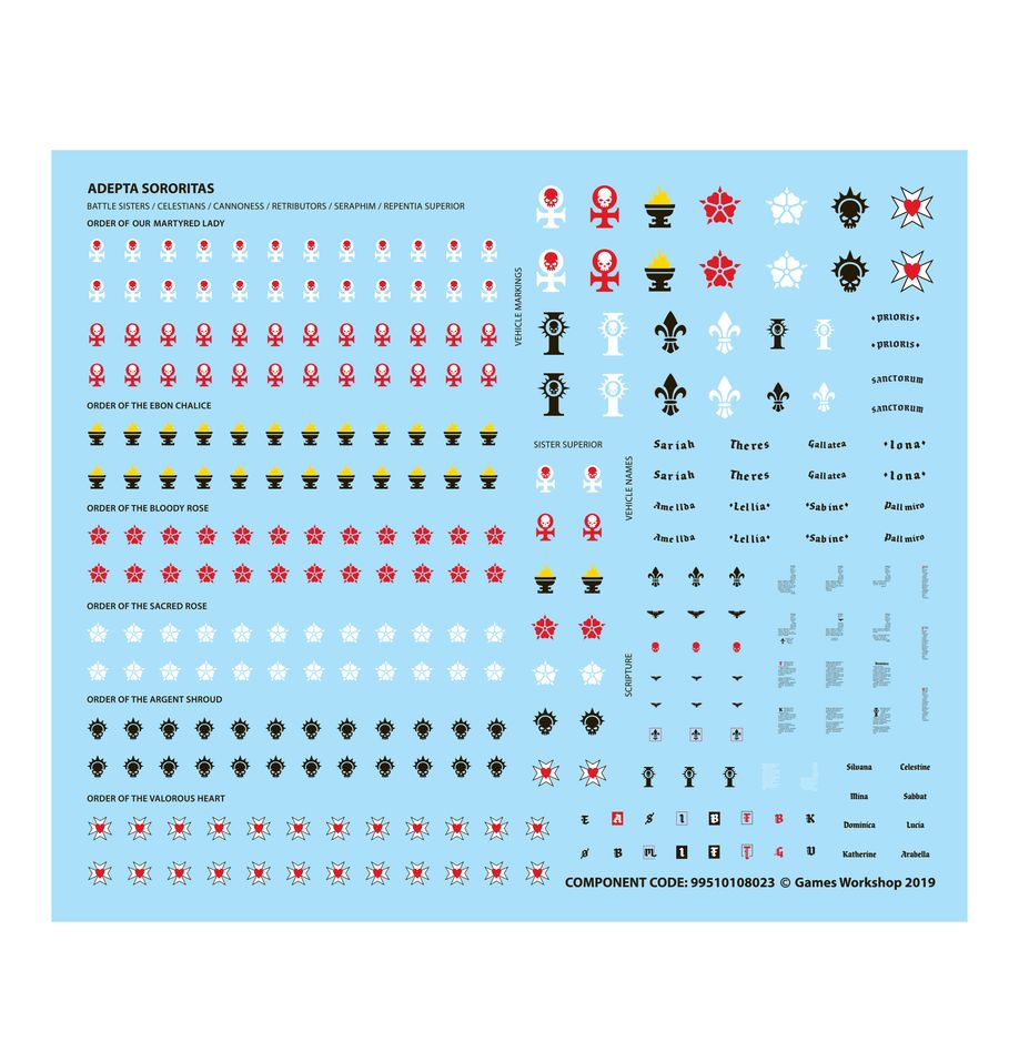 Цей набір складається з 128 пластикових компонентів і поставляється з 10 круглими основами Citadel 28,5 мм і 1 круглою основою Citadel 32 мм. До цього набору також входить 1 аркуш для перенесення Adepta Sororitas, що містить 290 високоякісних переказів для водних гірок, які ви можете використовувати для прикраси своїх моделей.