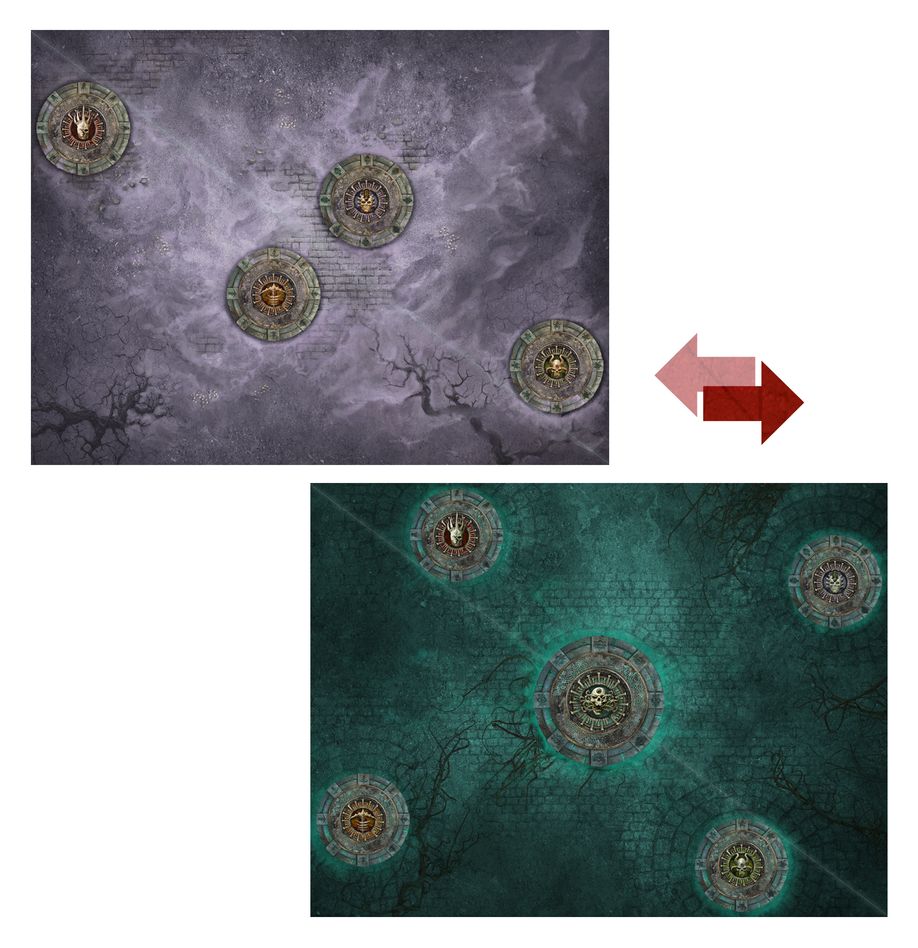– 6x Пластикових елементів ландшафту: Цей ландшафт зображує похмуру архітектуру, знайдену в Царстві Смерті. Два елементи надають особливі здібності сусіднім юнітам.