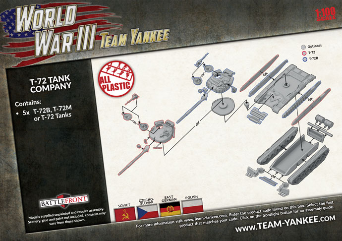 Набір включає п’ять пластикових танків Т-72Б, Т-72М або Т-72 і один пластиковий литник командира танка.